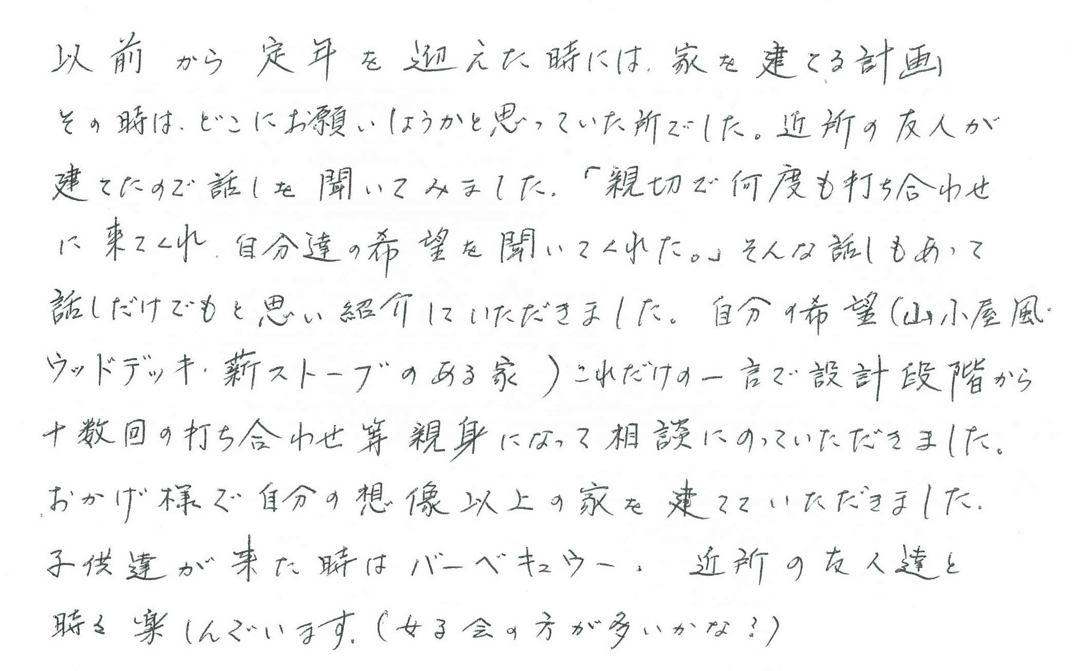 以前から定年を迎えた時には、家を建てる計画でした。 その時は、どこにお願いしようかと思っていたところでした。近所の友人が建てたので話を聞いてみました。 「親切で何度も打ち合わせに来てくれ、自分たちの希望を聞いてくれた」 そんな話もあって、話だけでもと思い紹介していただきました。自分の希望(山小屋風・ウッドデッキ・薪ストーブのある家)これだけの一言で設計段階から十数回の打ち合わせ等親身になって相談にのっていただきました。おかげさまで自分の想像以上の家を建てていただきました。 子供達が来た時は、バーベキュー、近所の友人たちと時々楽しんでいます。(女子会の方が多いのかな?)