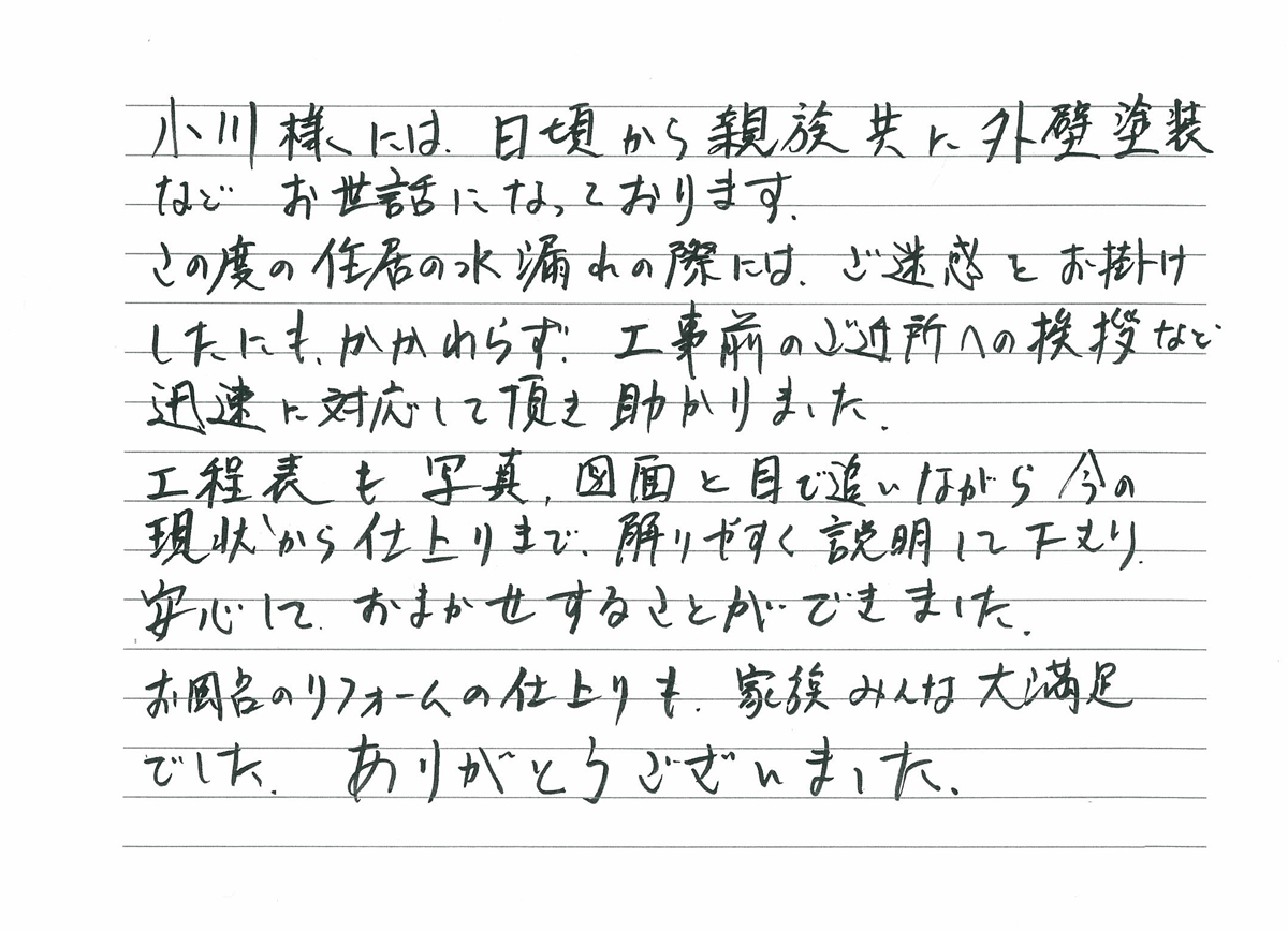小川様には、日頃から親族共に外壁塗装などお世話になっております。この度の住居の水漏れの際には、ご迷惑をお掛けしたにもかかわらず、工事前のご近所への挨拶など迅速に対応していただき助かりました。工程表も写真、図面と目で追いながら今の現状から仕上がりまで、解りやすく説明して下さり、安心しておまかせすることができました。お風呂のリフォームの仕上がりも、家族みんな大満足でした。ありがとうございました。