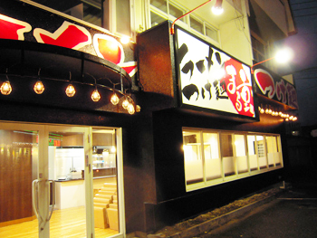 外部は店の正面と左右の壁全て、全面塗装を行い、看板は赤黒で目立つ用に照明も明るい照明にしました。
