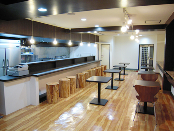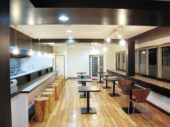 | 「店舗奥側」 店舗の照明はテーブルの数及び配置から決定し、明るさは少し控え気味にバランスの良い明るさにしました。厨房は十分な明るさの照明で清潔感をだしました、内装も既存クロスは剥ぎ取り部分的に色を変えポイントをつくりモダンな仕上げにしました。 |