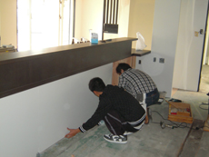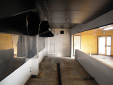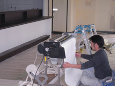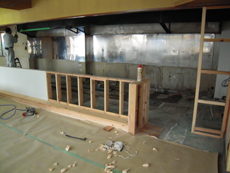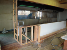 「厨房、カウンター」 カウンターの配置やサイズを決定する事により、厨房機器の大きさ、配置、使い安さ、電気容量、給排水位置などが決定されますので、現場で細かい寸法の説明をしての立会で決定しました。 |