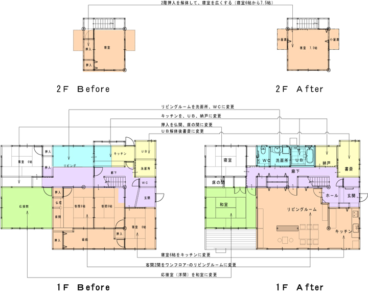 築40年2階建住宅です。南側に広縁、6畳と8畳の二間続きの部屋があり、客間として利用していたが、みんなが使う部屋にしたいとのご要望でした。