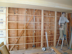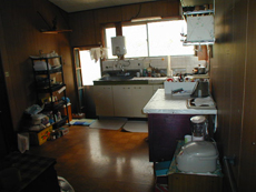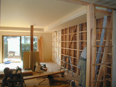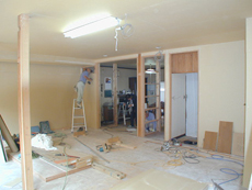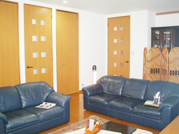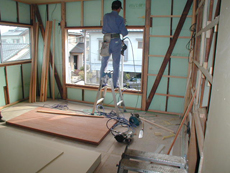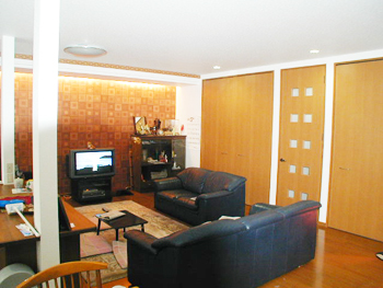 新規床組、フローリング張り、壁天井用に新規下地組をしてプラスターボードを張り、仕上げにクロス貼りを行いました。また、外部開口部はペアー硝子サッシに取り替え広いリビングルームとしました。