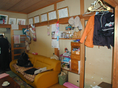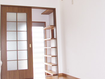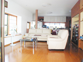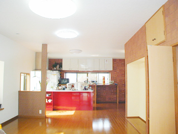 「母屋LDK」 和室と洋間の間にドアがあり、キッチンと居間がそれぞれ独立した部屋でした。床、壁、天井を解体、畳は処分してフローリング張りのバリアフリー床に右側の押し入れはお洒落な飾り棚いろいろな小物を置ける事ができます。広くてお洒落なLDKになりました。 |