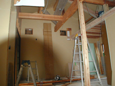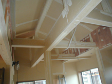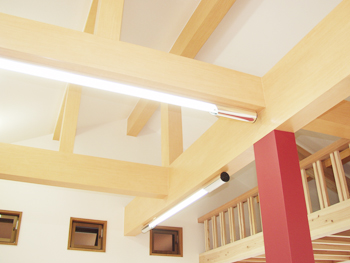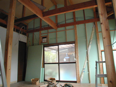 床を新規床組のフローリング張り、ロフト用の梁組にし、小屋組はそのままの梁を利用してプラスターボード下地のクロス貼りをしました。また、照明はモダンな感じにしました。