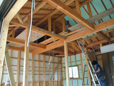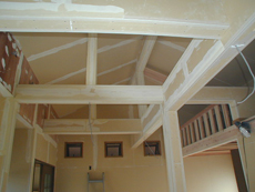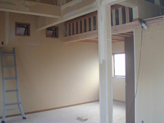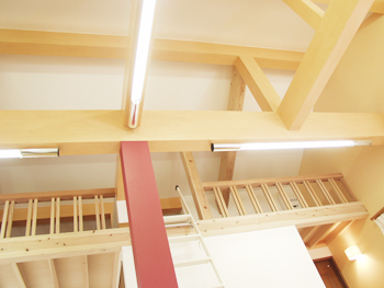 「倉庫 ロフト」 ロフトは杉の化粧梁に杉で加工した手摺りを取り付け、ポイントにしました。 |