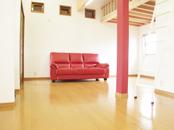 | 「倉庫 寝室」 内装は新築工事です。床は無垢のフローリング張り、部屋全体はホワイト色のクロス貼り中央の柱はソファーに合わせたレッド色にしました。 |