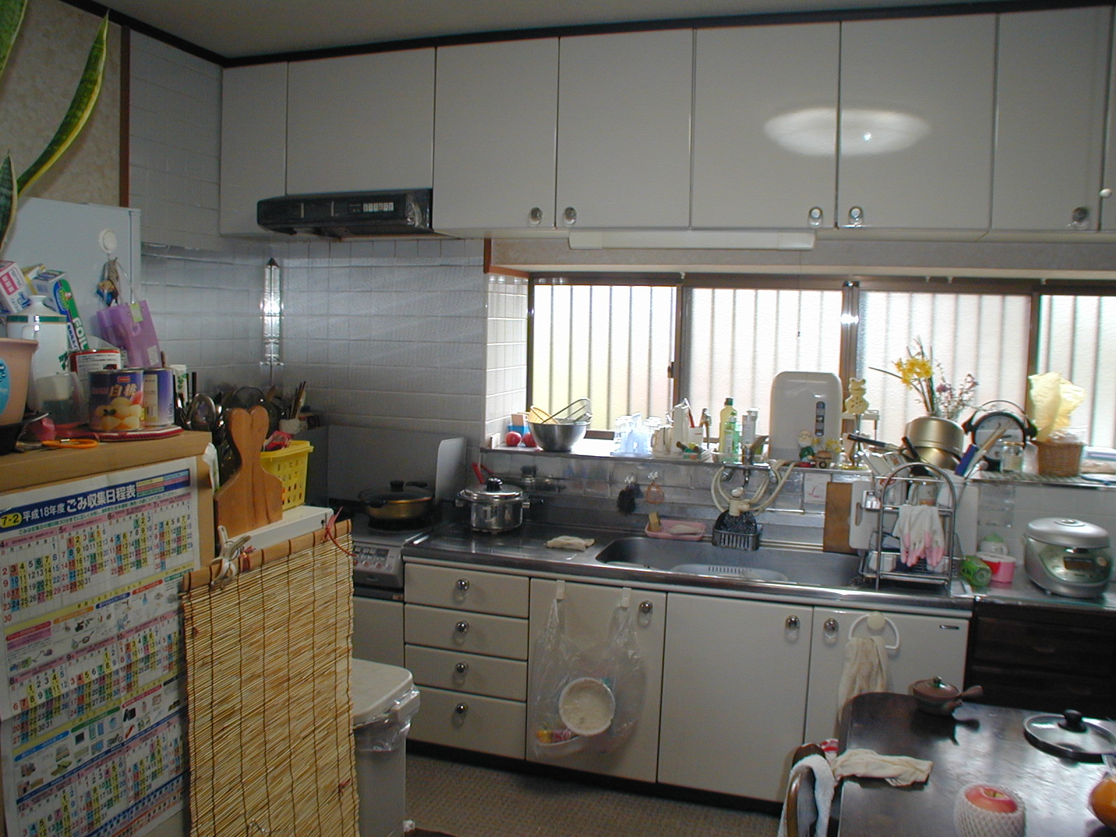 | 「母屋のキッチン」床 壁 天井 キッチン 床、壁、天井は解体、窓側の流し台は対面式のシステムキッチンとなり子供達と一緒に料理を造ったり、家族みんなと会話しての食事がとても楽しいです。 |