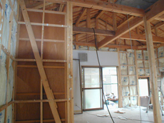 「倉庫 寝室」 倉庫内部全て解体、壁、屋根には断熱材(ミラフォーム)を使いました。新しくロフト用の梁組加工を、柱、梁をデザインとして強調しました。木目を生かしたダイノックシート張りでお洒落な部屋になりました。 |